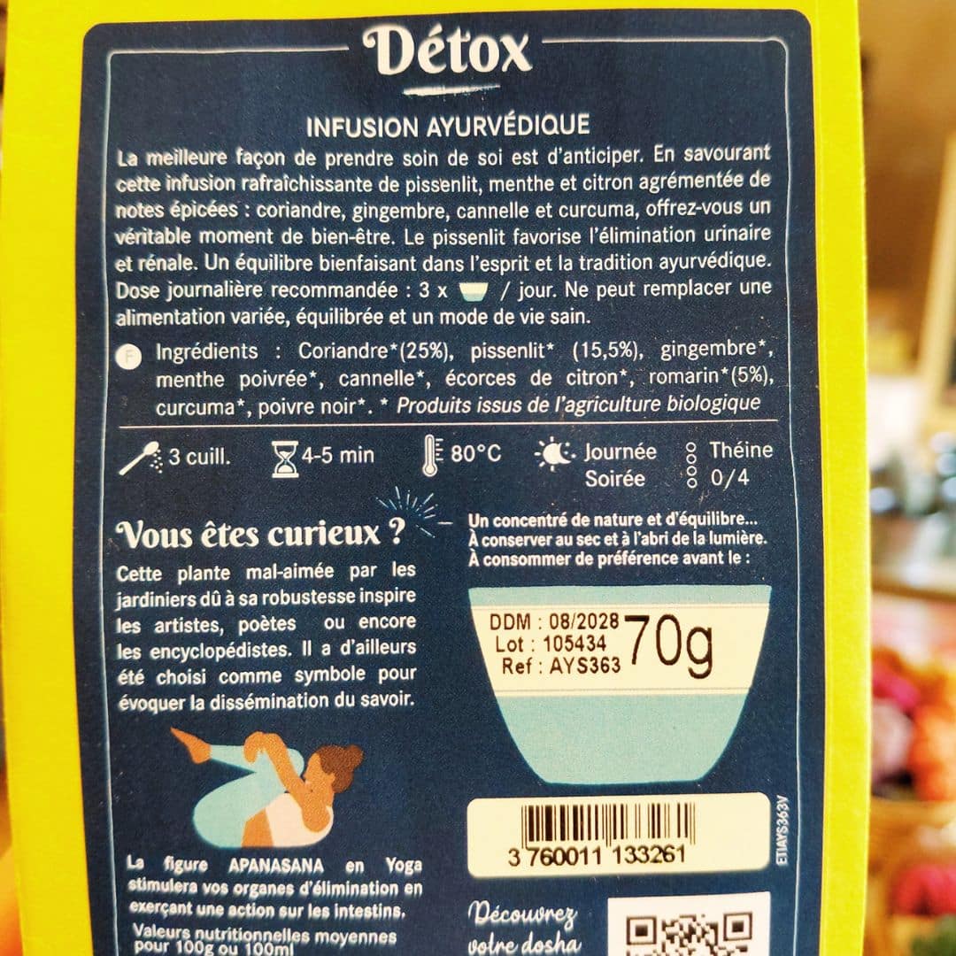 Coriandre* (25%), pissenlit*, gingembre*, menthe poivrée*, cannelle*, écorces de citron*, romarin* (5%), curcuma* (3%), poivre noir*.